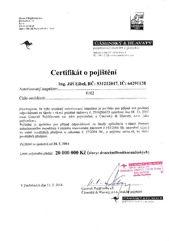 Osvědčení o autorizaci - Osvědčení o jmenování autorizovaným inspektorem - Certifikát o pojištění