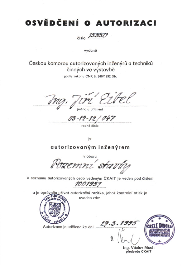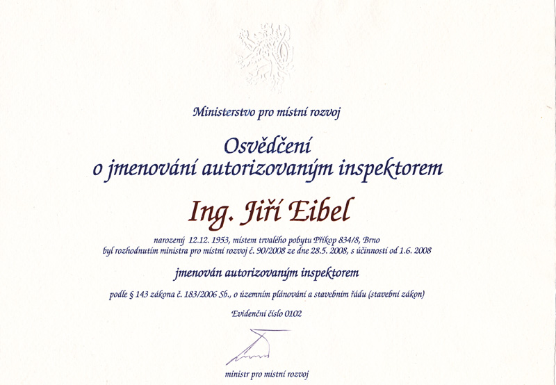 Historie inženýrské a poradenské činnosti Ing. Jiří Eibel se datuje od 90.let. Postupem času byla tato činnost doplněna o činnost Autorizovaného inspektora od roku 2008. Autorizovaný inspektor je jmenován ministrem pro místní rozvoj za splnění zákonných podmínek (VŠ vzdělání stavebního směru, nebo arch. směru, min.15 let odborné praxe v projektové činnosti nebo vedení stavby, autorizace dle zvl. práv. předpisu, bezúhonnost a prokázání znalostí před odbornou komisí jmenovanou ministrem pro místní rozvoj).